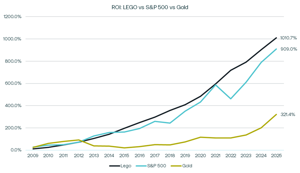 Illustration: ROI for Purchasing Every LEGO Set Released in 2009 vs. Investing Equivalent Funds in S&P 500 or Gold (2009–2025). Percentage return on investment from 2009 to 2025 for matched portfolios of LEGO, S&P 500, and gold. Source: Brickfact.com